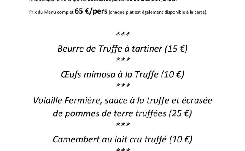 Accueil Auberge de Saugras Menu spécial Truffe à partir du 22/01 au Dimanche 24/01 par Thierry Aillaud 22 janvier 2021 Menu spécial Truffes cliquez ici Navigation de l’article Article précédent : Vaccination COVID comment faireMenu de la cantine semaine 09Article suivant :