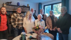 Les Ă©lus de la commune ont eu le plaisir de rendre visite Ă  Mme T. afin de cĂ©lĂ©brer avec elle un Ă©vĂ©nement exceptionnel : son 100ᔉ anniversaire. Une rencontre emplie d’émotion et de partage, en prĂ©sence de sa fille et de son gendre, autour d’un gĂąteau et d’un joli bouquet de fleurs offerts pour l’occasion. M. le Maire avait Ă©galement apportĂ© quelques bulles Ă  partager et a prononcĂ© un petit discours chaleureux. TrĂšs touchĂ©e par ces attentions, Mme T. a exprimĂ© toute sa joie lors de cette visite.