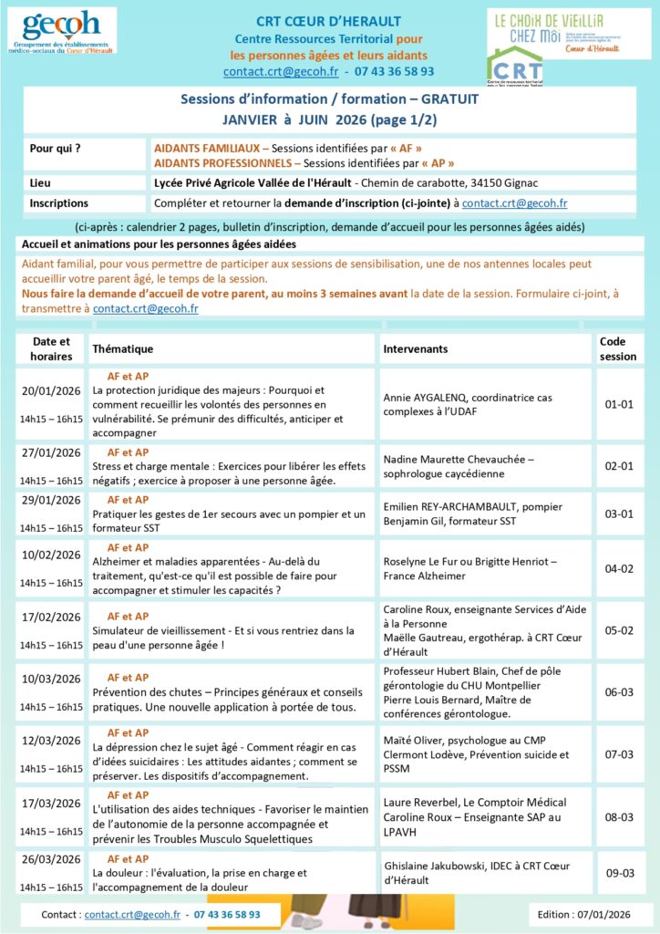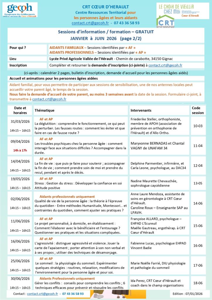 Le CRT Cœur d’Hérault a le plaisir de vous informer de la publication du calendrier des sessions de sensibilisation pour le 1er semestre 2026 dédiées à toutes personnes, professionnels et particuliers, concernés par l’aide, le soutien ou le conseil aux personnes âgées.