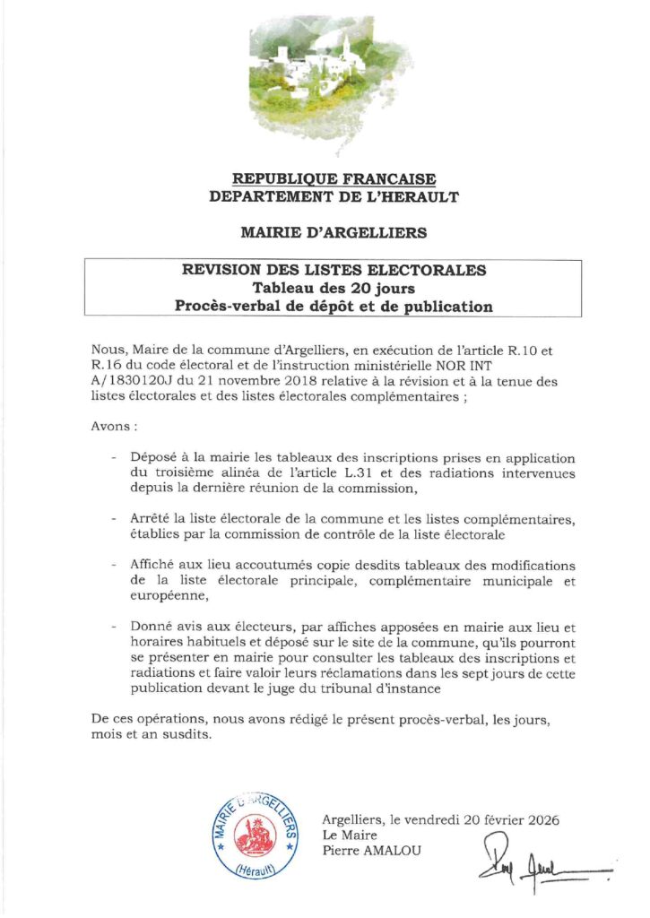 Au 20ème jour précédant le scrutin, la commune doit publier le tableau des mouvements intervenus sur la liste électorale depuis la dernière révision de la liste.![]()
