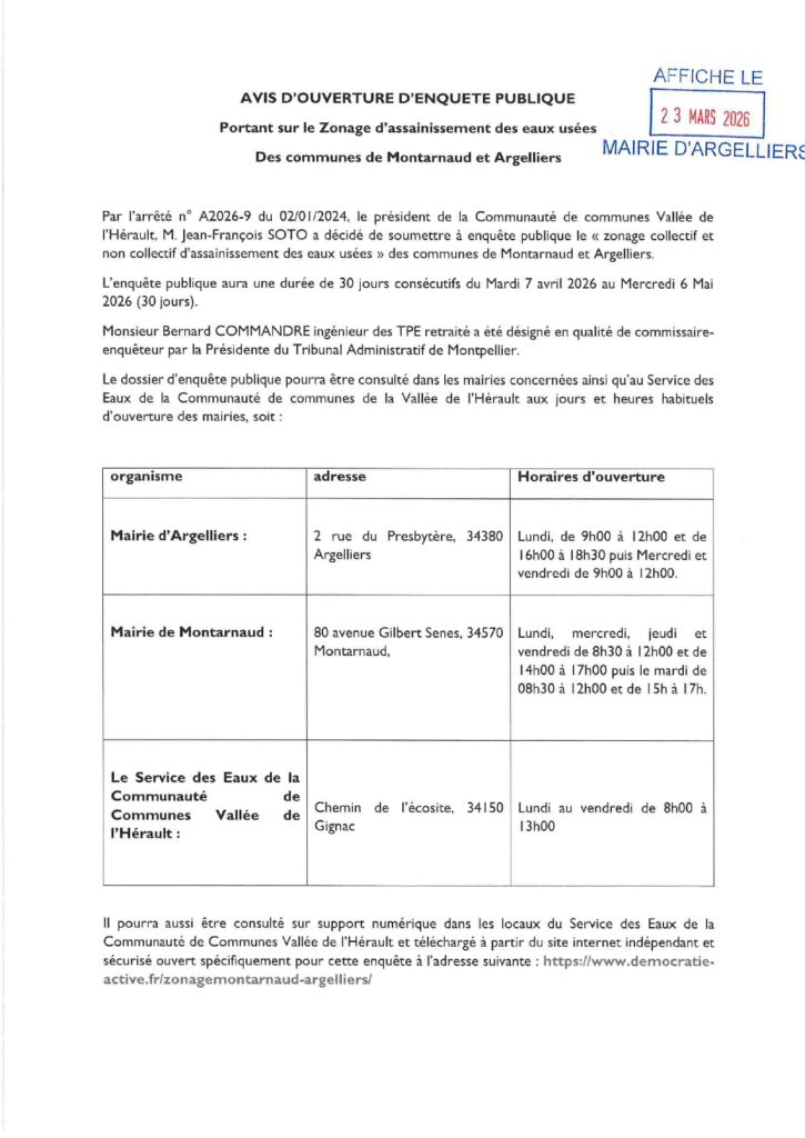 Avis d’ouverture d’une enquête publique portant sur le zonage d’assainissement des eaux usées des communes de Montarnaud et d’Argelliers du 07/04 au 06/05/2026.
